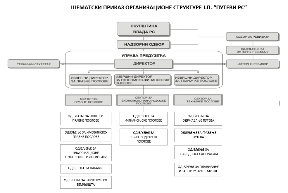 Шематски приказ организационе структуре ЈП „Путеви РС“ приказан је на слици доле: